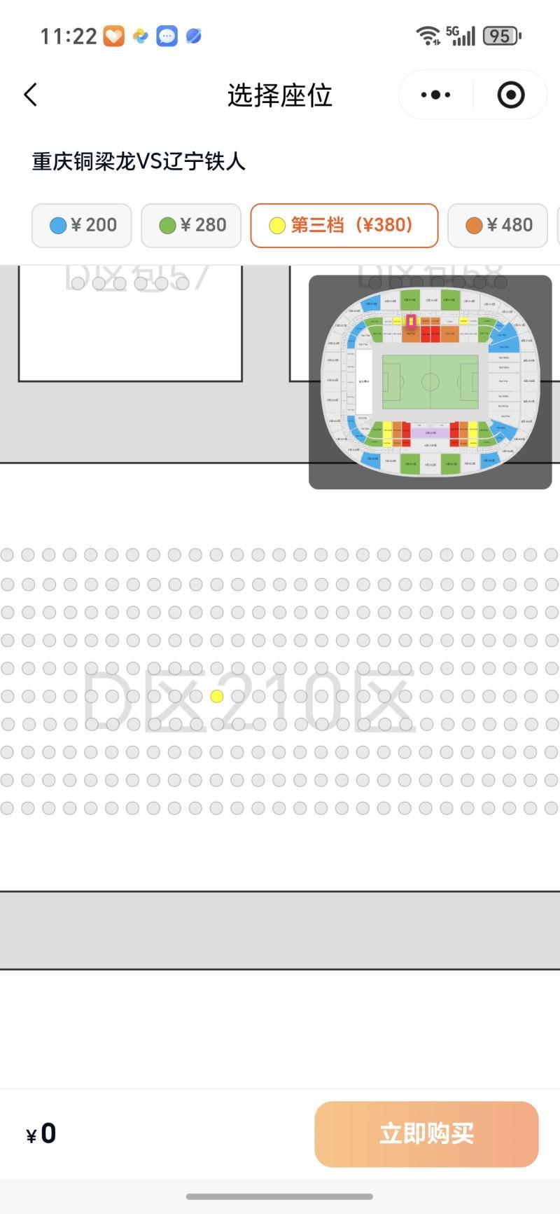 380元价位球票还有大量余票(灰色圆点为可选位置)。网络截图